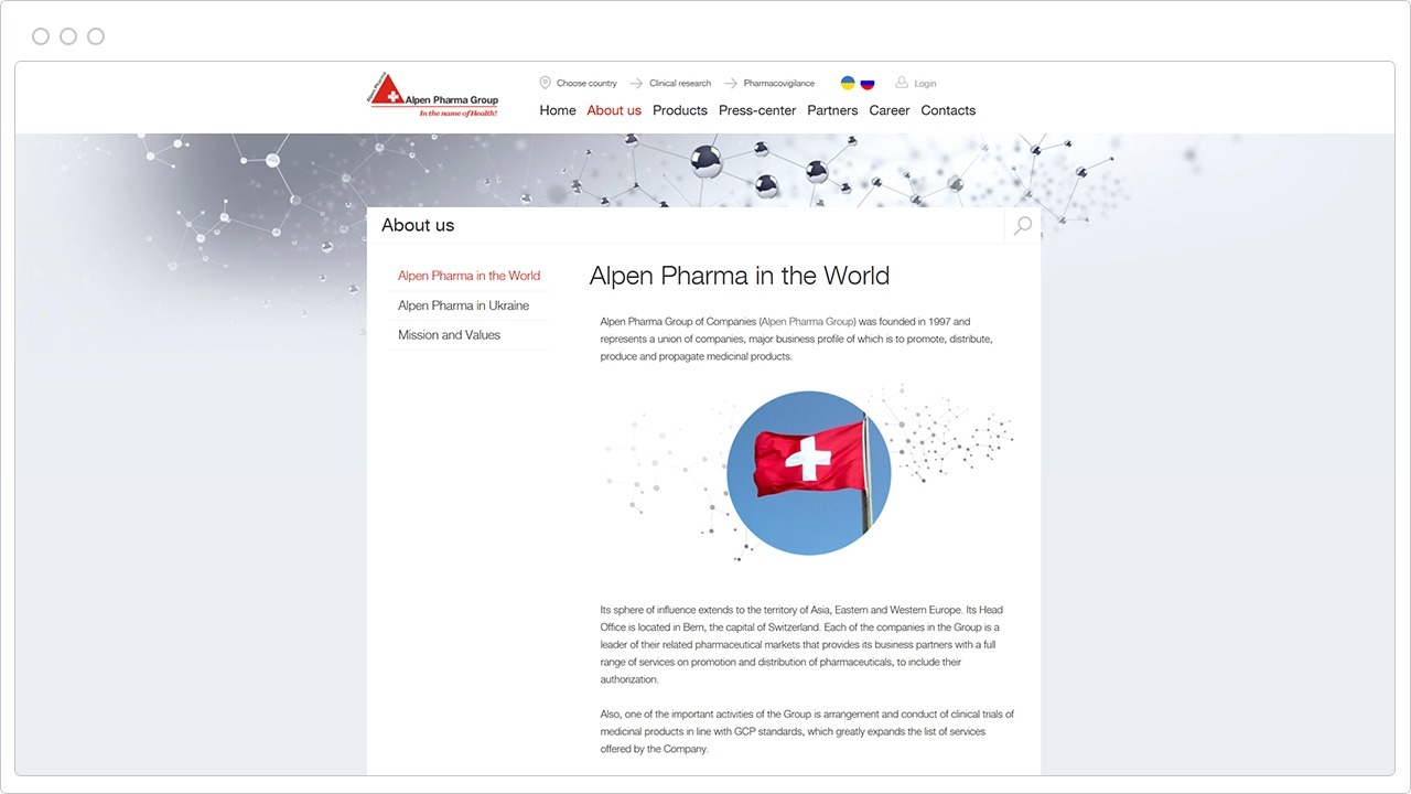 Група компаній "Альпен Фарма" (Alpen Pharma Group) започаткована у 1997 році. Це об'єднання компаній, основним профілем яких є промоційно-дистриб'юторська діяльність, а також виробництво та просування лікарських засобів. Сфера її впливу поширюється на територію країн Азії, Західної та Східної Європи. Головний офіс знаходиться у Швейцарії.
